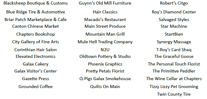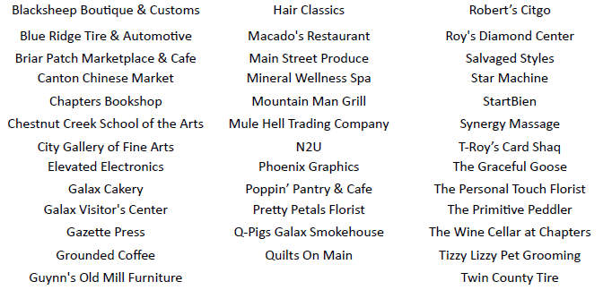 Downtown Dollars are redeemable at restaurants, shops, and businesses in Downtown Galax.