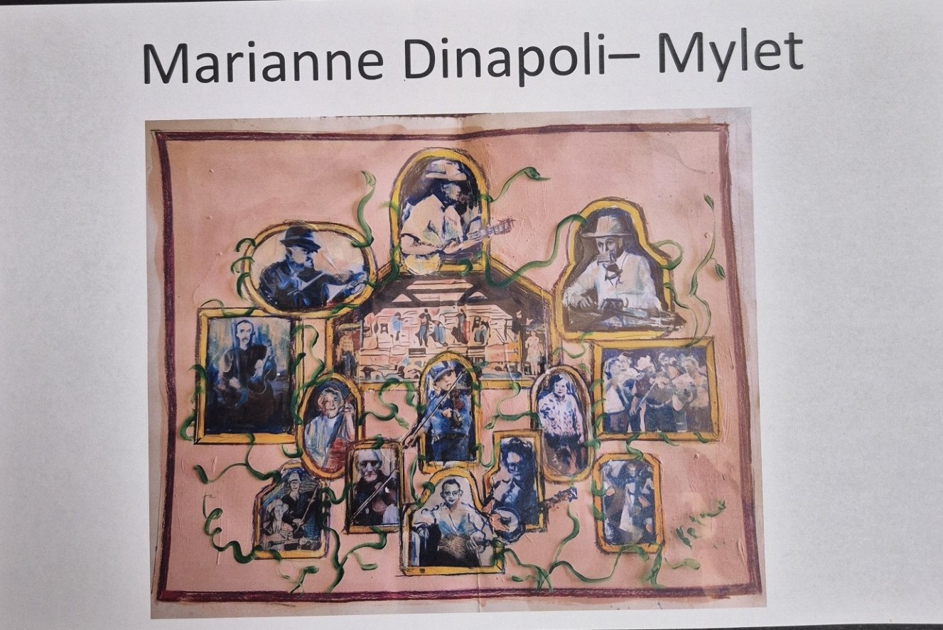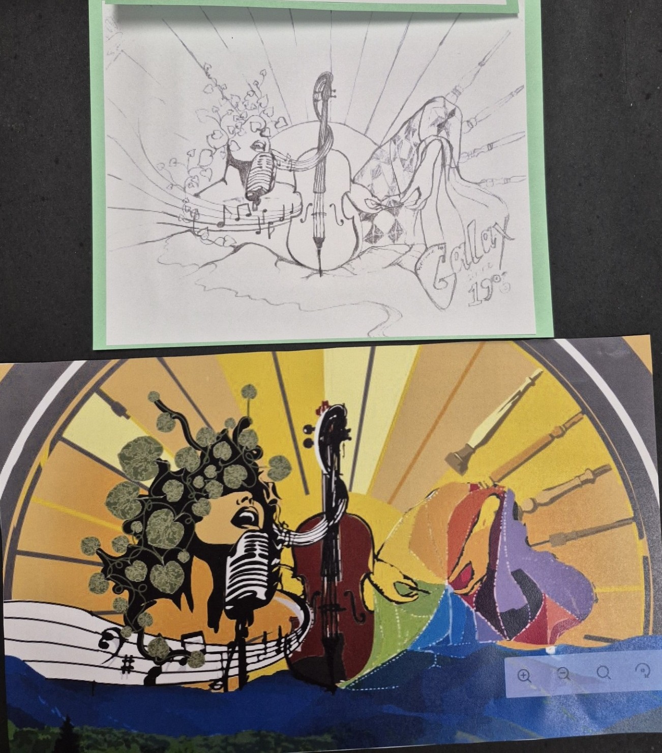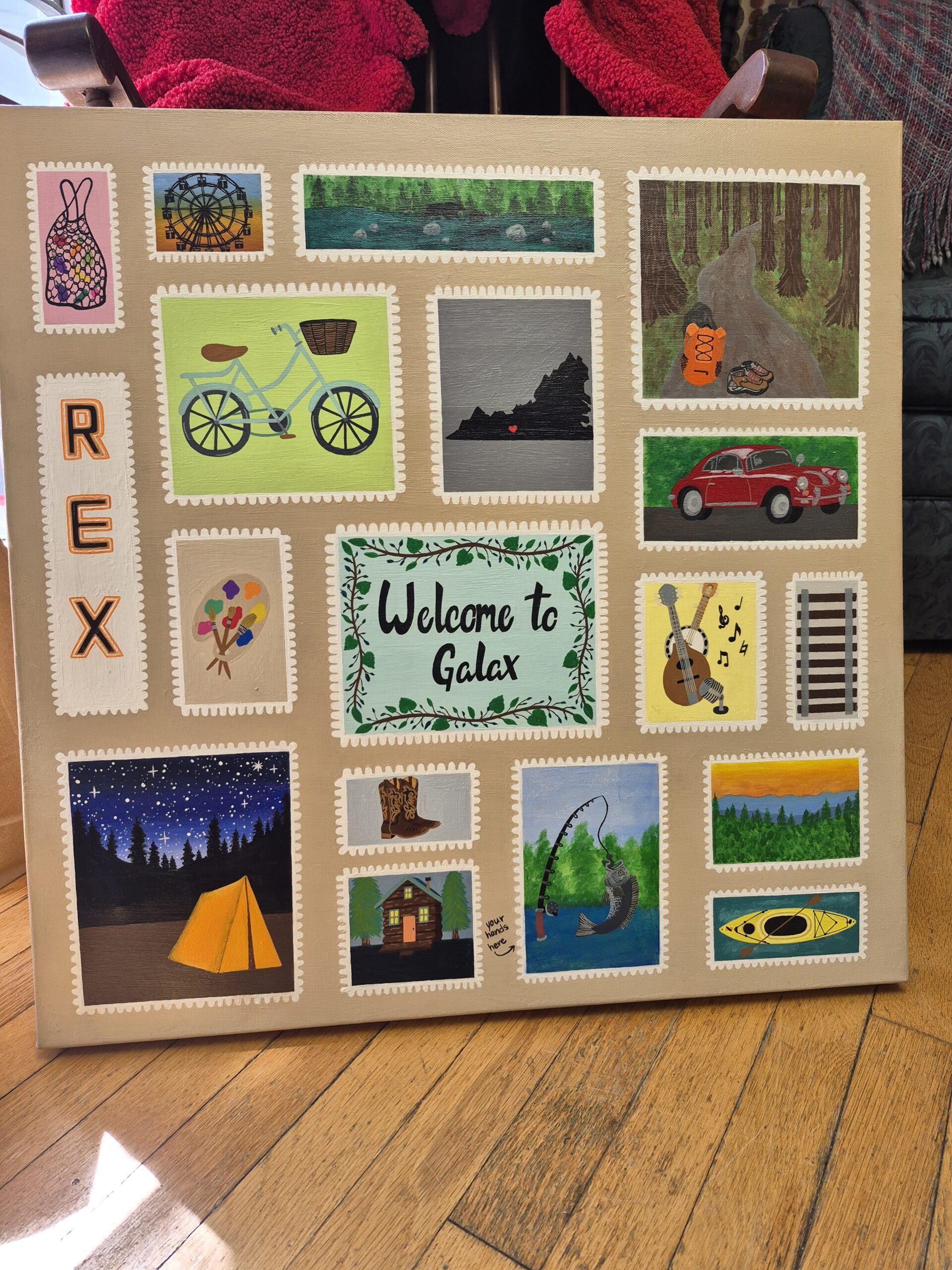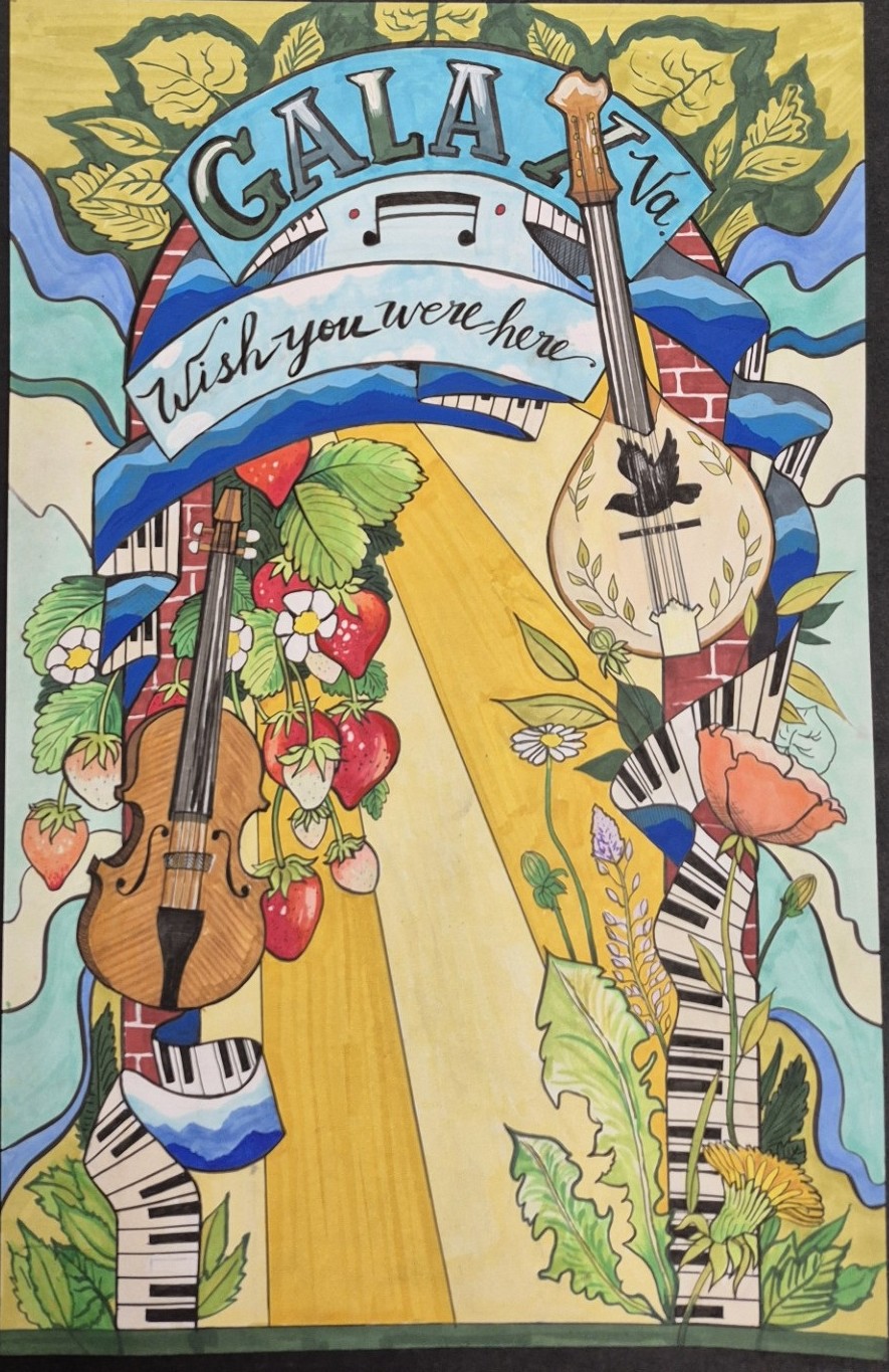 My motivation for this piece is to create an image that is larger than life drawing attention to Galax’ musical history. Music is such a strong art form, that we all have in common, that the act of not only making music, but just listening to it brings communities together. The image I created is meant to share that sense of family representing that moment of creating art(music), by depicting an intimate jam session of folk/bluegrass artists and musicians’ instruments as if you are sitting amongst them and they’re playing just for the viewer.
