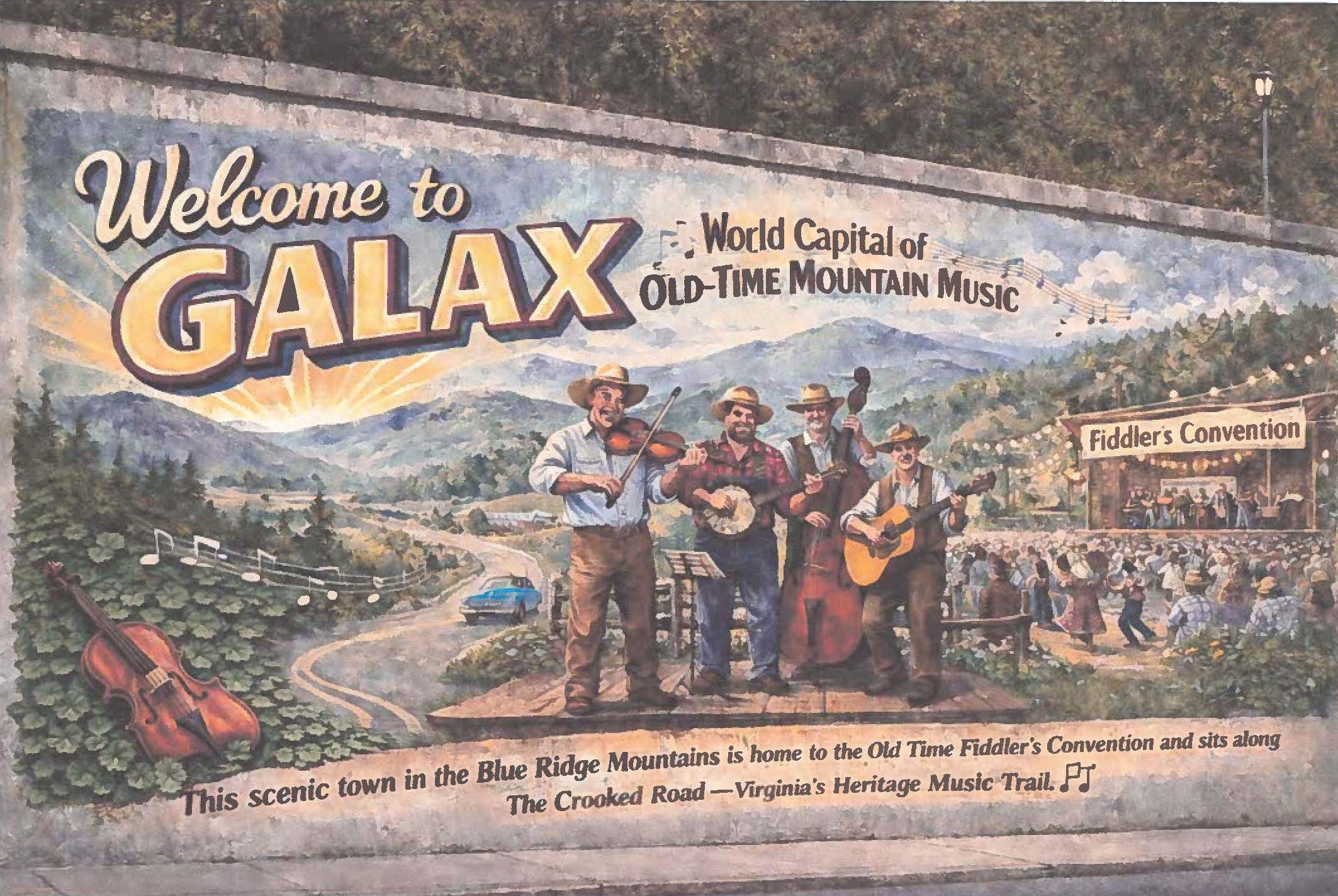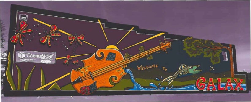 The mural depicts the roots of Old Time Music in and around Galax – Tommy Jarrell, Kyle Creed, Ernest (Pops) Stoneman, Emmet Lundy, Katie Lundy Golding, early Ernest and Hattie Stoneman, Luther Davis, Otis Burris, Marokie Slaughter, Bobby Patterson, early Katie Golding and band, and Whit Sizemore and the Shady Mountain Ramblers. In the middle is a band at the Fiddler’s convention and a young boy on fiddle – demonstrating the future.
