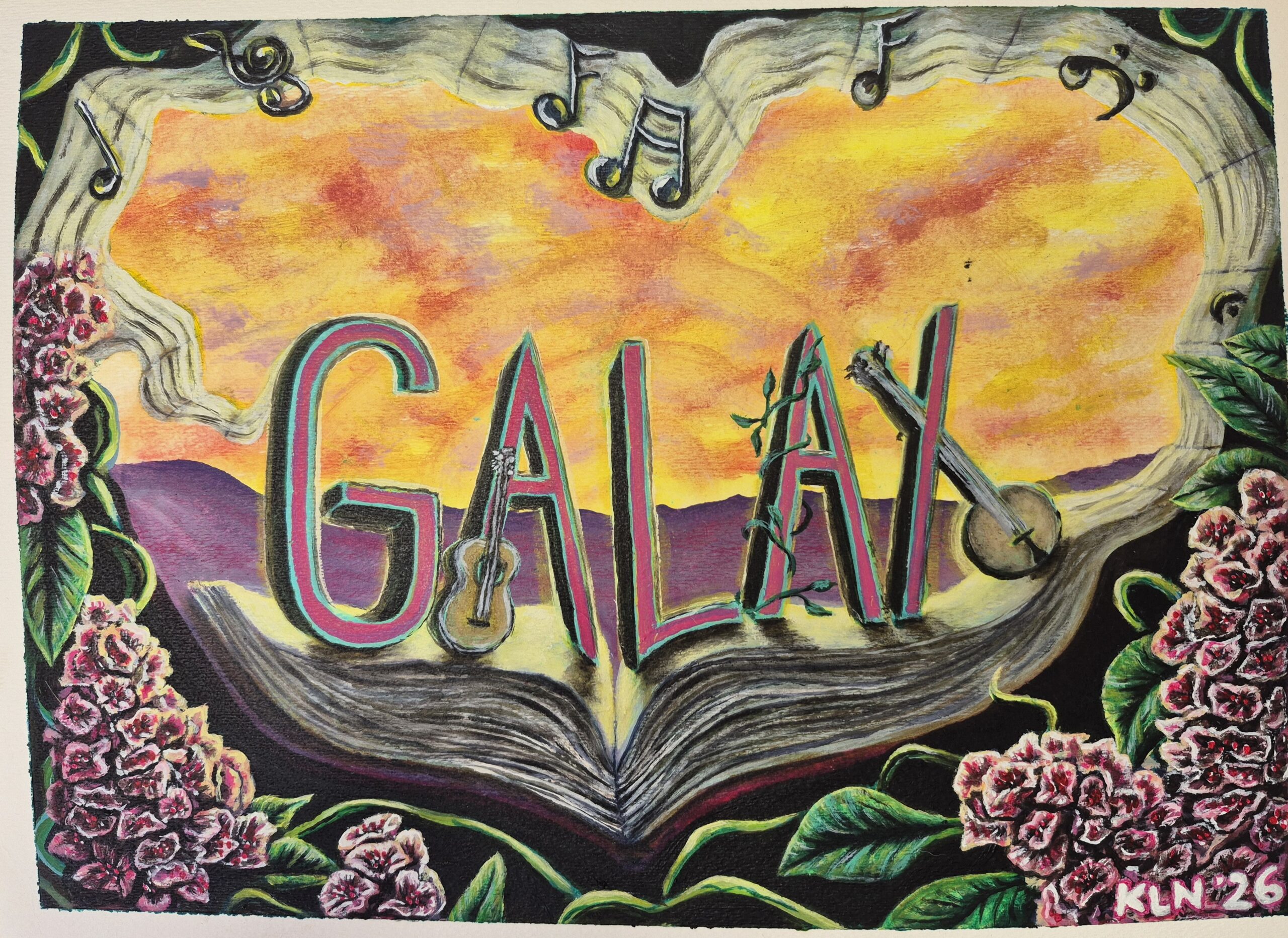 For this mural, I wanted to create something bold and eye-catching that would serve as a beautiful photo opportunity for visitors while also capturing what makes Galax special. The mountains in the background evolve into the pages of a storybook, holding and telling the stories of traditions and the culture that has grown here over generations. Lush mountain laurel frames the scene, so full and vibrant that viewers can almost smell the blooms, transporting them to a quiet laurel thicket beside a mountain creek. Sheet music drifts and dances across the glowing sunset sky, subtly forming an abstract Galax leaf-a tribute to the deep musical roots of the community and a tie to our native foliage. It's an honor to be a part of this mural selection process and to create something to celebrate Galax as I have always felt it to I'm so proud of our community and excited and hopeful for our blooming future here.