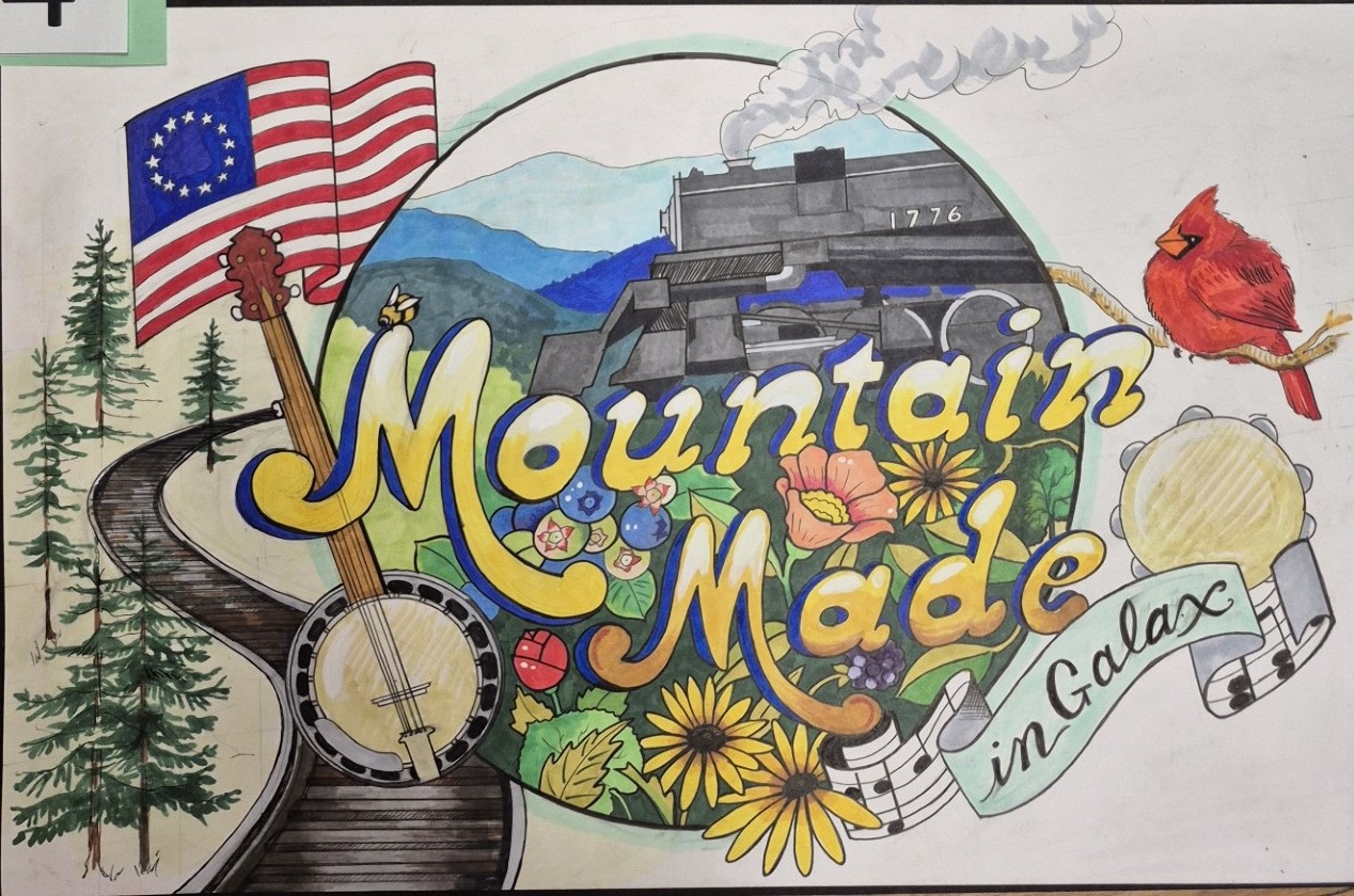 This mural is a visual tribute to the cultural identity and landscape of Galax, Virginia – a place where music, craft, and the outdoors interact to form a living heritage. The composition brings together symbols that represent the rhythms of life in this mountain community.