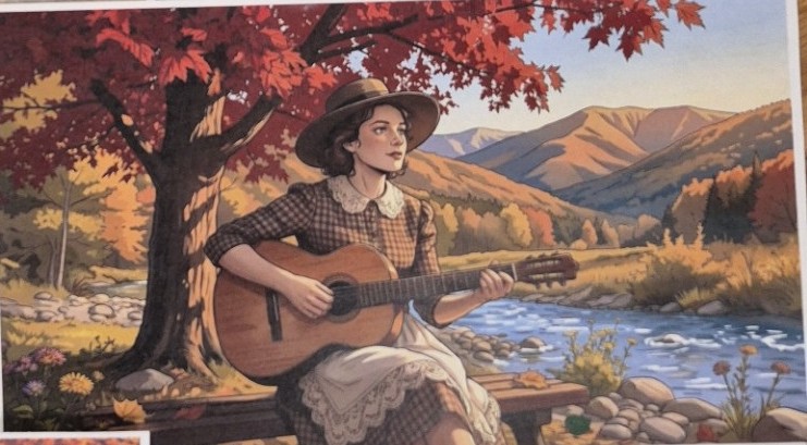 At the center of the piece, musical imagery emerges through a fiddle and vintage microphone, representing the deep bluegrass and old-time traditions that define the region. Galax has long been known as a gathering place for musicians, where melodies are passed down through generations and music remains a vital thread in the community’s cultural fabric. Flowing musical notes connect these elements, suggesting the continuous movement of sound, history, and shared experience.